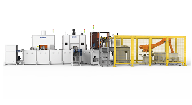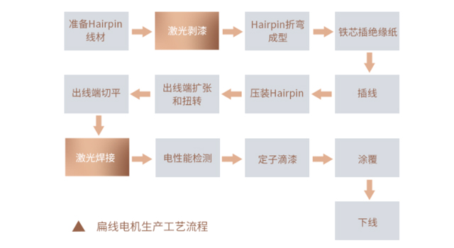 准备Hairpin线材→激光剥漆→Hairpin折弯成型→铁芯插绝缘纸→插线→压装Hairpin→出线端扩张和扭转→出线端切平→激光焊接→电性能检测→定子滴漆→涂覆→下线