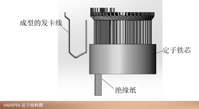 典型的 Hairpin 定子结构如图所示,主要包含定子铁芯、绝缘纸及成型的发卡线